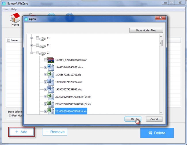 第1步:在Windows上运行isumsoft filezero。首先需要下载isumsoft filezero实用程序,然后将其安装到Windows桌面上。安装完成后,启动它。第2步:点击左下角的添加按钮,弹出“打开”对话框。找到要永久删除的文件,选择它们,然后单击“确定”。