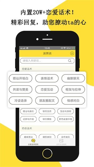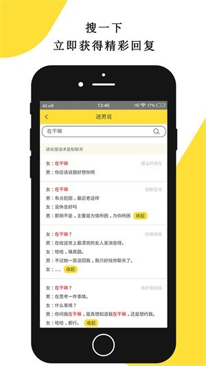 1、丰富话术迷男说app内置20W+聊天话术,你根本不需要去学习聊天!遇到不知道怎么回复时搜一下,N+精彩回复供您选择。
