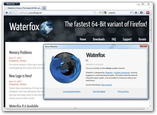 64位系统下的64位应用毫无疑问会带来更好的性能,mozilla的firefox虽然版本更新极快,但64位版本却始终步履蹒跚,而且它非常早期和不稳定,对于64位系统的朋友们来说用什么来提升浏览器性能呢,答案是waterfox 8.0,这应该是目前最稳定的windows 64位版本的firefox修改版,它改进了大内存和64位计算的细节,让firefox在64位下速度更快,运行更顺畅。