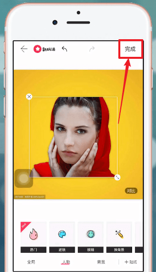 5、选中背景,点击人物可调整其大小与位置,调整完毕后点击【对勾】;
