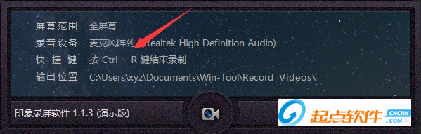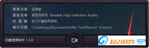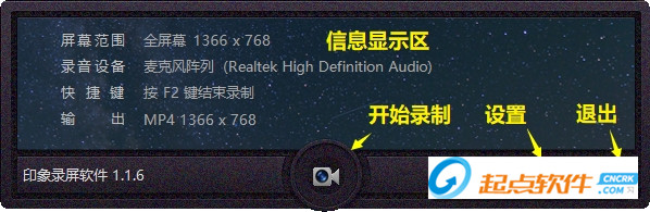 主界面印象录屏软件的主界面采用非常简洁的中控台设计,在主要部分实时显示当前用户设置的录制信息,包括屏幕范围、录音设备、快捷键和输出信息等。
