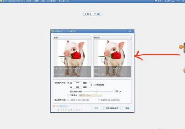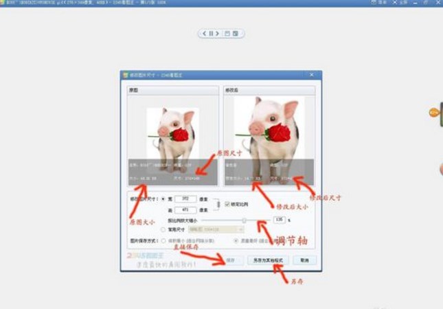 这时我们只要在这个窗口中调节“按比例放大缩小”这根轴即可了,向右移动为调大,向左为调小,而左边为原图,右边为调节后与左图形成的对比大小,我们还能在图中看到图片的属性大小,我们可以根据需求调整图片大小