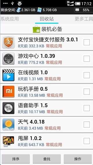 安全保障一:业内首创"云建议"功能!告诉您在"系统应用"中哪些是可以卸载的第三方预装应用,哪些是是系统自带的应用!安全保障二:最好用的"回收站"功能,让卸载成为可逆操作(回收站位于sd卡)得心应手的卸载