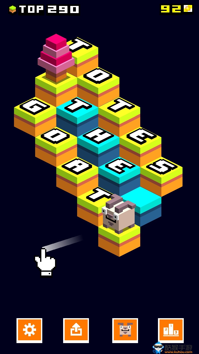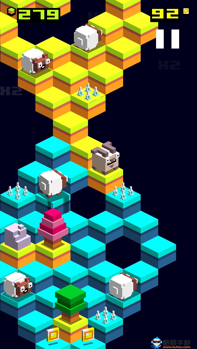 Totes the Goat《跳跃山羊》这款游戏与怀旧经典游戏《Q伯特》十分相似,一开始主角是一只萌萌哒的小山羊,玩家需要控制它从最高处不断跳跃将整个地图都变成自己的颜色便会过关。当然,会有很多其他的怪物乱入扰乱玩家胜利的路线,如果玩家不幸碰到怪物即马上游戏结束。除了那只萌萌哒的山羊作为主角外,可以利用收集的金币解锁其他不同的小动物来更换可控制的主角。