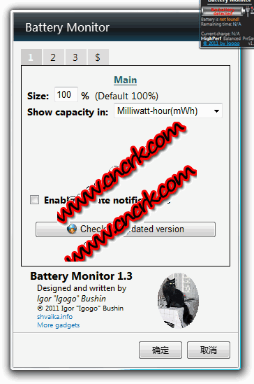 battery monitor是一个windows 7/vista的桌面小工具,可以显示当前剩余电量和电池使用状态,适用于笔记本用户。