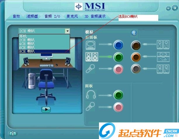 1.选择“音频I/O”,将“2CH喇叭”改为“8CH喇叭”这样做可以解决游戏内声音小的问题