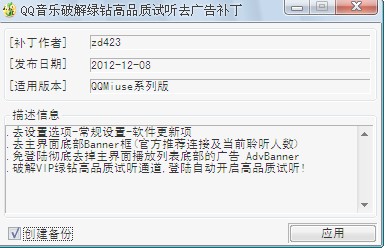 QQ音乐破解绿砖去广告补丁是一款真对QQ音乐的QQ音乐去广告补丁,在本地破解QQ绿钻会员功能,一键去除QQ音乐广告,给您更好的音乐享受。