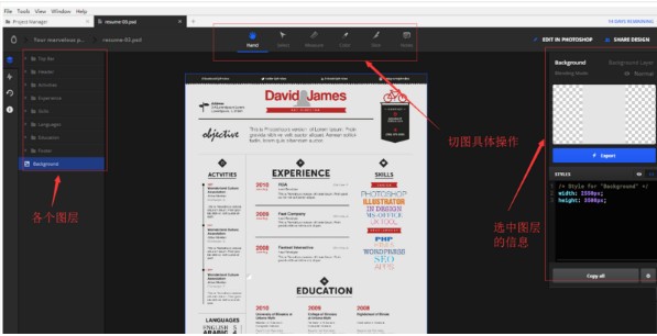 3、打开这个psd之后,可以看到很多工具栏。在界面中的左边,有四个按钮图层、活动信息、版本记录、psd的多种相关信息。上边的工具栏是对psd进行具体的切图工作。右边的工具栏显示的是具体选中或者进行操作的获得的图层信息。