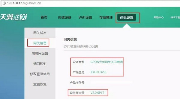 一、首先检查光猫型号和版本号设备类型: GPON天翼网关(4口单频)
