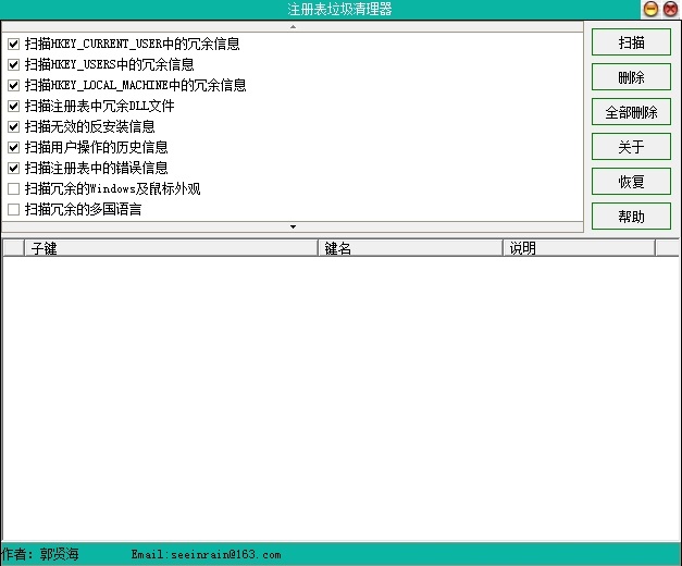 注册表垃圾清理器是一款非常实用的注册表垃圾清理工具,小巧易用,主要功能可帮助您来对电脑的注册表垃圾文件进行快速的扫描,并对指定的文件进行清理操作,同时支持注册表恢复功能。【使用方法】