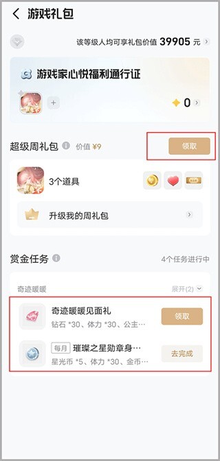 4、成功绑定后,点击页面上的“开启通行证”,即可在下方领取游戏礼包。
