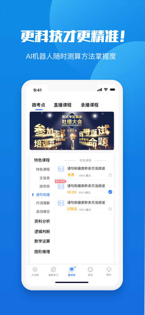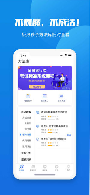 魔方公考app是一款公务员考试方法类学习APP,集中了476位命题阅卷专家、218位一线教学名师以及1792名公考职位状元对考点的把握和解题方法精华,并且结合了最新人工智能计算机技术,可以最大范围内满足学员对优质方法的需求,并且可以准确测算和提高学员对具体方法的掌握程度,从而大幅度提升学员的学习效率和考试成绩。【软件特色】