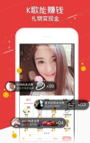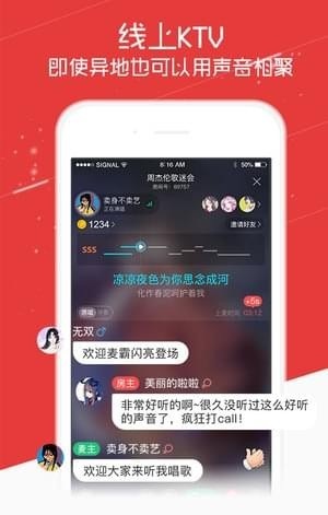 1、K歌直播,随时在线K歌互动,圆你一个主播梦2、附近签到抢地主,展示自己主打歌