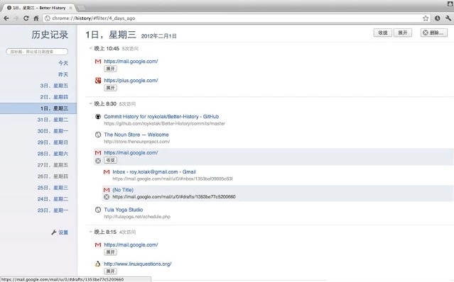 1、点击Chrome右上角的Better History插件按钮,用户即可看到以日期分组的Chrome历史记录列表,如果该列表过多,用户还可以选择展开或者收起该记录,如图所示: