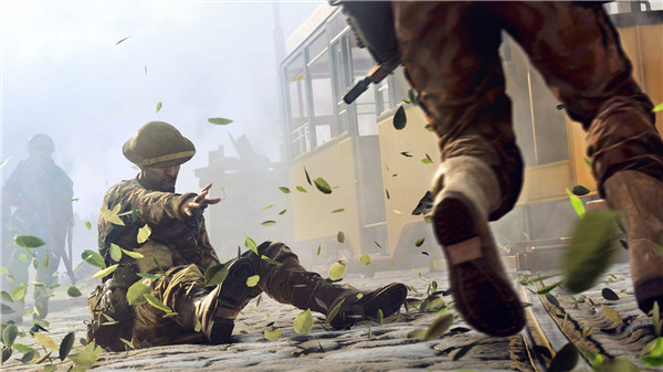 3、然后可以注意到有位士兵(类似奎爷的那位)跳下坦克后,踉跄倒地,这也是新作中的新引进的一种动作机制,就是玩家角色在不平整地面上跑动时,可能会出现以第三人称的视角呈现的踉跄或是被困住。