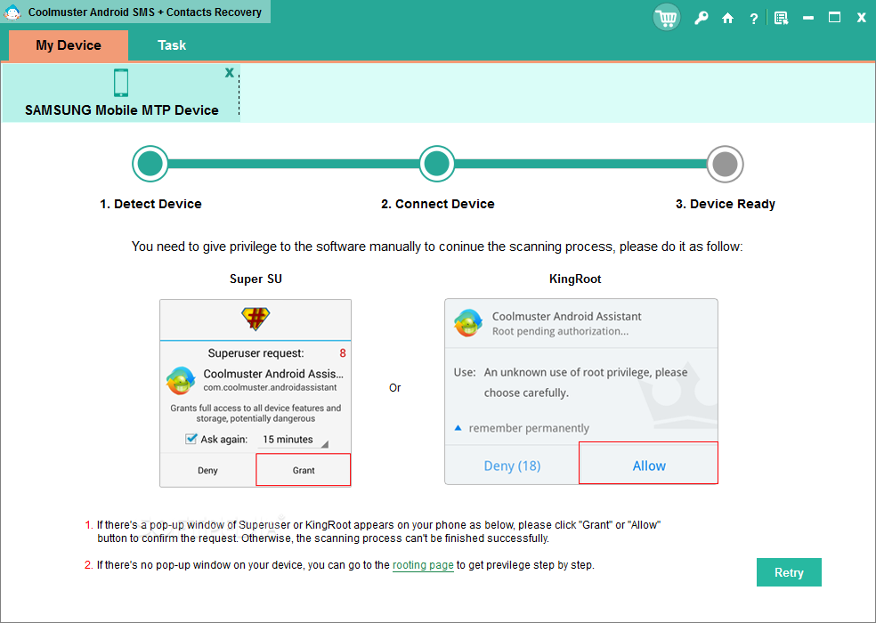 该计划将做的第一件事就是深入,快速地扫描您的Android手机,并且可以预览所有已扫描的短信和联系人,包括联系人数据。转到此处了解如何使程序识别您的Android设备。