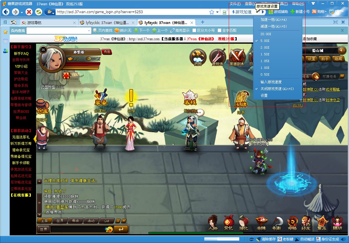 1)游戏变速功能操作方法:当游戏加载完成后,点击糖果游戏浏览器上的游戏加速按钮,就可以给游戏加速5倍。点击游戏加速的下拉菜单,然后选择“输入游戏速度”,即可随意设定游戏速度的倍数。