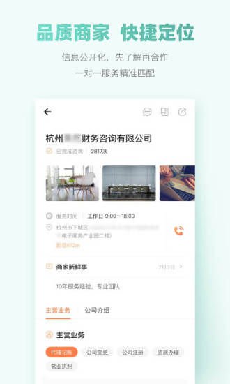 3、预约咨询服务,一键预约,办事不用等,在APP上了解商家具体信息以及主营业务,选择适合自己的机构,线上交流,预约服务。