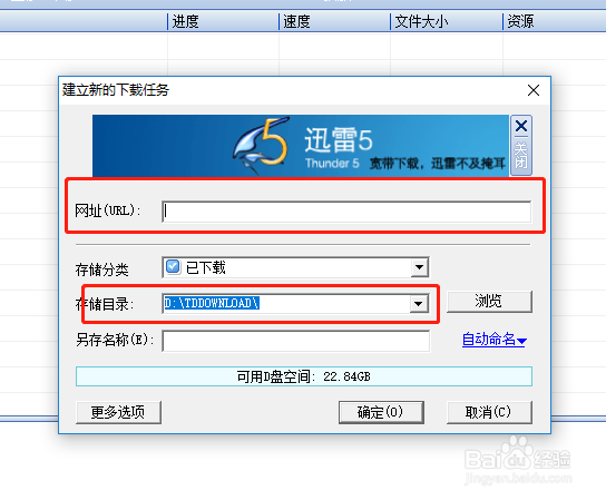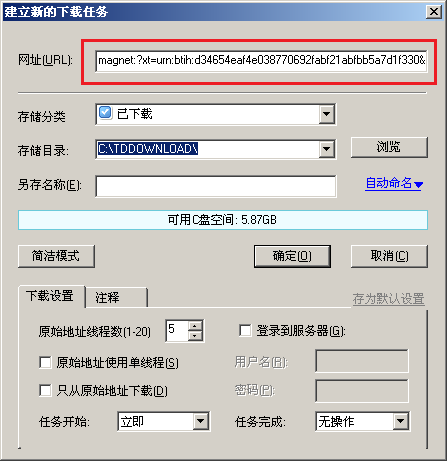 出现迅雷新建面板,注意地址栏,是个磁力链接。点击确定