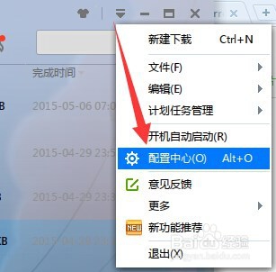 当我们利用迅雷下载“Bt种子”或“磁力链接”文件时,弹出“种子下载失败”的提示后,我们对迅雷进行设置:点击界面右上角的“设置”下拉菜单,从弹出的列表中选择“配置中心”项。