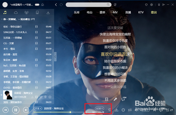 第四步加速到1.5倍之后,点击歌词,可以看到歌词明显变化加快,声音加快,如下图所示: