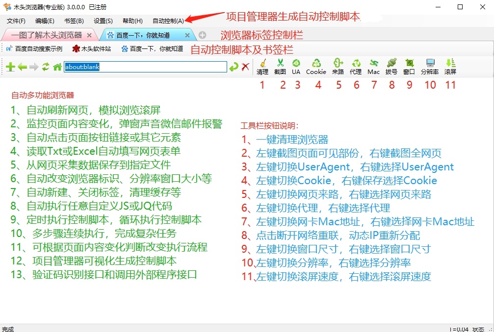 木头多功能浏览器是一款具有较强专业性质的一款行业浏览器,它可以生成自动刷新网页监控网页局部内容变化,具有网页自动点击、自动批量填写表单等功能;浏览器完美支持HTML5,多用户多选项卡的调整网页浏览器。在一台电脑上实现登录同一个网站的多个帐号,并且可以在多个帐号间随意切换。