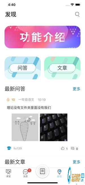 老师与学生一起的特色班级课堂,可以轻松探讨学习问题;问答区可供学生在学习过程中遇到百思不得其解的问题时进行提问,或者回答其它同学的问题;