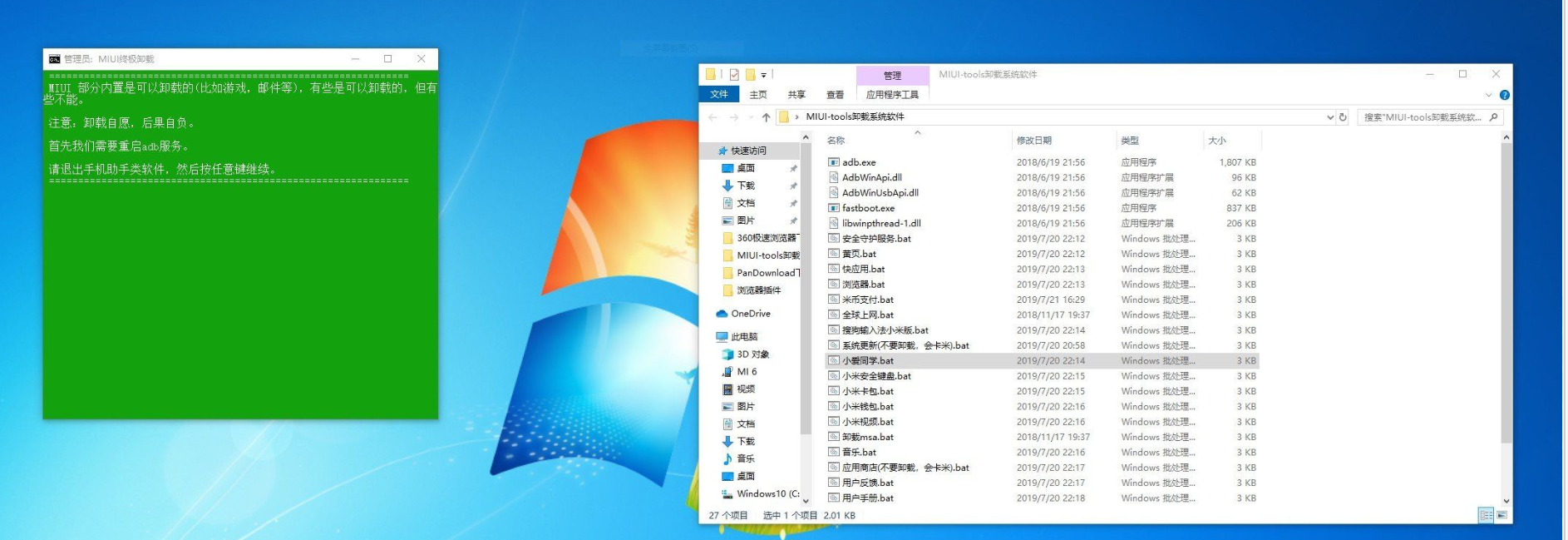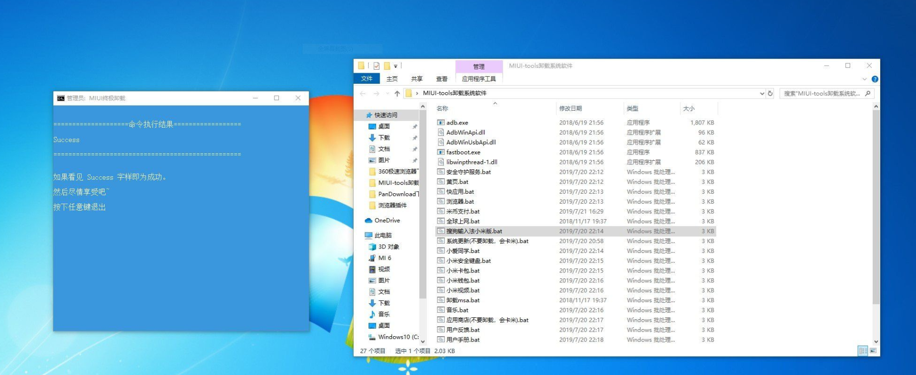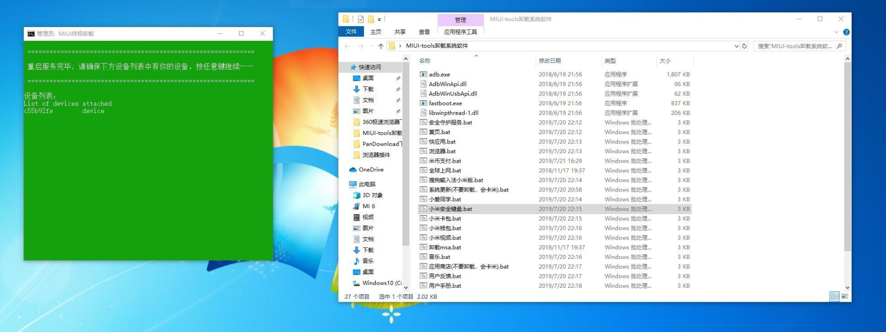 点击MIUI版本,直至出现处于开发者选项,进入选择USB调试,usb安装,usb调试(安全设置),点击运行bat文件,如果失败可以再试几次,亲测小米4、6、红米note7pro可用,基本上小米通用。【使用方法】