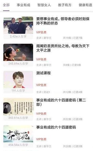 平台围绕家庭建设设置六大学习体系:事业有成、智慧女人、教子有方、健康有道、家风家训及百年好合篇;