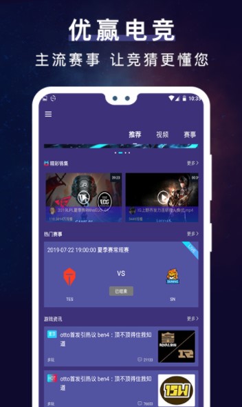 优赢电竞软件,主流赛事让竞猜更懂你,每一场游戏都是非常有意思的。你想要的精彩瞬间就在这里,聚集全国游戏大神,随时在线交流互动。超多电竞赛事都在这里,随时看比赛!