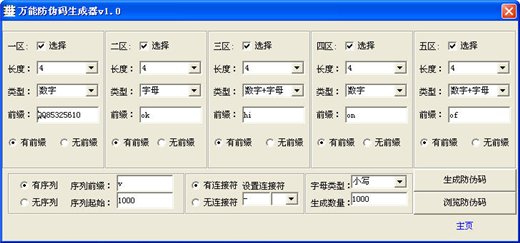 万能防伪码生成器功能强大,应用灵活。生成效率高,是喷码机的好帮手!也是生成随机密码,效验码,序列号,或者卡号密码的好工具!