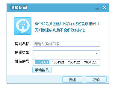 点击主面板上的创建房间按钮,按要求填入指定资料即可申请到一个7位号码的房间,请注意创建房间成功后的回收规则