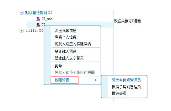 在房间面板的成员列表区域选中某个用户后,可通过鼠标右键中的【权限管理】来对此用户进行相关权限管理。
