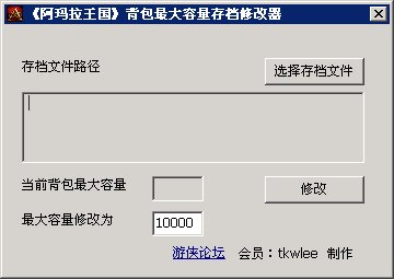 阿玛拉王国:惩罚背包最大容量修改器 找到存档文件路径后修改最大容量为自己设定的数值即可! 工具会自动备份存档,添加.bak后缀,如果修改之后后悔了,把.bak去掉即可。