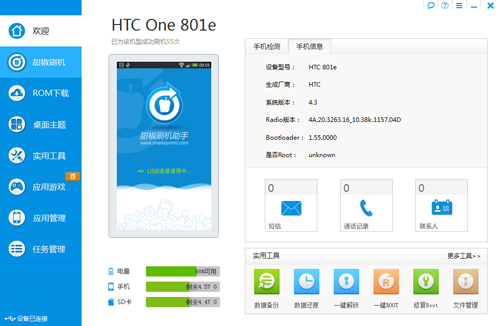 软件的最后一页提供了不少刷机中需要遇到的小工具,有针对特殊机型的小工具,如检测BL(MOTO)、HTC辅助解锁工具。还有众多手机通用一键换字体、清除密码、释放内存等小工具。