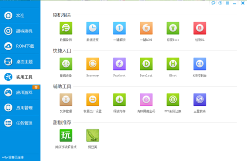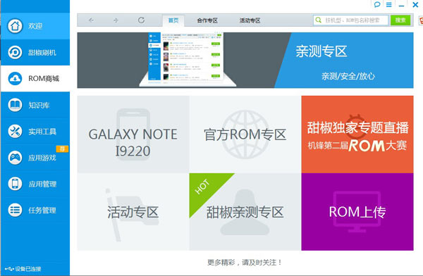 甜椒在UI处理上做的比较朴素和简单。使用灰色背景界面展示信息较为简洁大方,给人一种独特且朴实的感觉。连上手机后会直接在ROM商城和知识库显示当前机型可用的第三方ROM资源及相应实用教程,非常方便用户操作
