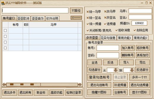 浮云歪歪YY多开辅助器 v1.22 绿色免费版 本软件完全免费使用,未加载任何广告,具备网络上主流yy辅助软件的大部分功能,此软件支持版本是yy4.0及yy4.1,支持无限多开yy,稳定多开yy不掉线,支持yy歌词(马甲及信息两种类别),yy帐号半自动注册,当然基本的辅助操作是肯定少不了的,比如说改马甲(可统一马甲及按表格修改)等等,还有支持自动刷花,自动信息等等功能,对了还有个yy音效哦!我想这些功能已经够用了吧!