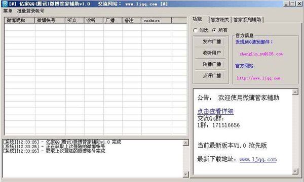 一键发布微博广播、批量秒听用户、一键转播广播、一键点评广播。