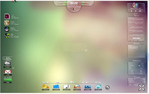 为了配墙纸找到的插件,下方的Taskbar上记事和天气预报部分可以弹出和收回是最大的特点。原本是纯黑加橙色边的现代风格,而下面图中是改了字体之后的效果,还不错吧?