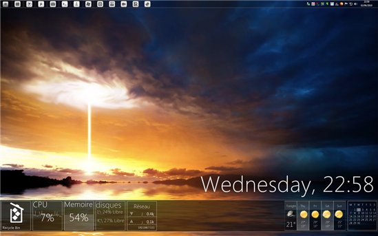 Rainmeter 可以在桌面上显示包括 CPU、记忆体、硬碟机、网路卡…等等装置的使用状况,让我们随时掌握目前是否有不正常的系统负载、记忆体不足或网路流量异常...等等问题,也可显示如时间日期、电脑对外的 IP 位址..等等资讯,还有个简易型的资源回收桶让我们直接按右键、清空LJ。如果你常常会需要用到 Google 搜寻引擎的话,最下面还有个快速搜寻框,按一下就可以快速查找你要的资讯,算是个满方便的小工具。