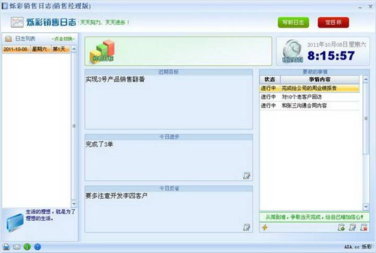 烁彩销售日志是为了帮助销售人员在工作中养成清晰、高效的工作方法。将目标、计划分解到每一天,变成具体的事情记录、跟进;还可以每日自我反省、找到差距。坚持使用并努力去实现每个目标,您的事业就会更进一步。