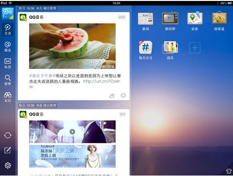 专为Android Pad设备打造的腾讯微博HD(Android Pad)1.4.0发布啦!新版增加多项给力功能:自定义背景、发送和显示带地理位置信息的广播、搞笑、美女等八大频道倾情奉献、调整字体大小……您可以通过平板设备访问Android Market,搜索“腾讯微博 HD”,下载安装后即可使用。