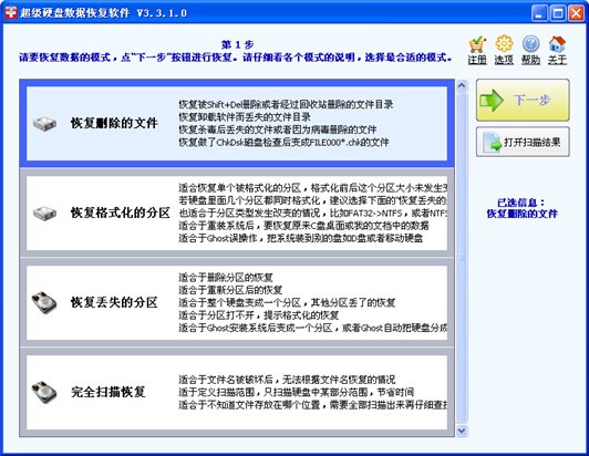 2、选择恢复模式,其提供了恢复删除的文件、恢复格式化的分区、恢复丢失的分区等多种不同的类型,用户可以根据自己的恢复类型来选择相应的恢复模式(选择恢复类型可参考模式右侧的信息),选择后点击【下一步】继续。