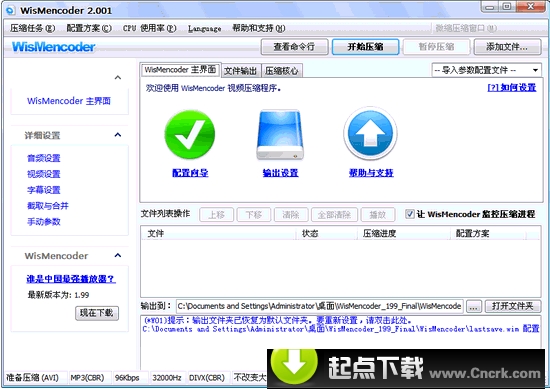 按照您计算机的CPU选择一个文件,将mencoderXX改名为mencoder之后就可以点WisMencoder.exe运行WisMencoder了。本压缩包内默认适合于奔腾四、迅驰以及之后出的CPU。