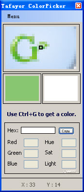 采集桌面色彩工具 抓取桌面颜色代码,简单的取色器 将鼠标移动到要采集色彩的地方按下鼠标左右键即可锁定取色!