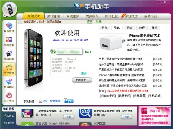 一、 连接设备将ipad、iphone等设备用数据线与电脑连接起来。(前提是你的手机已经越狱完毕)然后打开91手机助手。