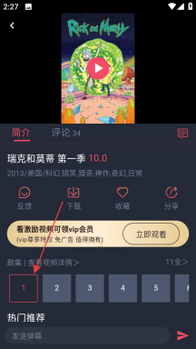 4、当你进入《瑞克和莫蒂》第一季的详情页面后,点击1就能观看第一集。