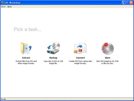 ISO Workshop 是一款非常不错的免费制作iso镜像文件工具,该软件支持ISP提取、备份、转换、刻录,包括CD、DVD、蓝光光盘。在任何格式,您可以轻松地再现原CD、DVD和蓝光。ISO Workshop操作简洁,主界面有四个大图标:从ISO提取文件、备份光盘镜像数据、转换ISO到其他镜像格式、刻录ISO到CD或DVD光盘。 支持的格式有 ISO、CUE、BIN、NRG、CDI、MDF、IMG、GI、PDI、DMG、B5I、B6I 等,支持的光盘类型有 CD-R/RW、DVD-R/RW、DVD+R/RW、DVD+R DL、BD-R/RE等。映象文件,跟镜像文件就是一个意思,取自翻译的外文“image ”。 一般国内大陆似乎用镜像文件的比较多,台湾等叫映象文件。它是一种光盘文件信息的完整拷贝文件。包括光盘所有信息,所以需要专门的虚拟光驱软件,载入此种镜像文件,进行读取,完全模拟了读取光盘文件的特性,这方面的软件有Alcohol 120%,Deam Tools等比较出名