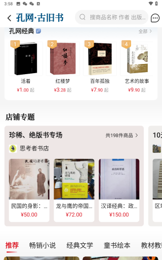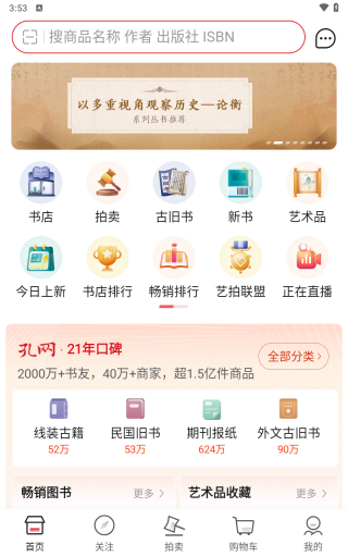 孔夫子旧书网是一款专注于二手书交易的应用程序。与其他平台相比,孔夫子旧书网的书籍种类更为丰富,无论是明清时期的古籍、民国时期的周刊、老照片还是签名本,各类图书一应俱全。该软件设有拍卖区和书店区两大板块,用户能够以最实惠的价格购买到心仪的书籍,并且所有商品都保证正版,购物体验极为安全可靠。如果你正在寻找绝版或历史悠久的书籍,不妨下载这款软件,开始你的寻宝之旅吧!
