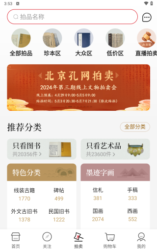 2、竞拍:实时参与拍卖竞价,低价起拍,满足不同层次的购书、收藏需求